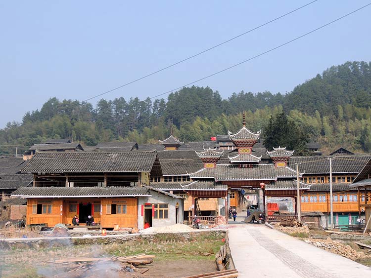 ここまで街道の南側をあるいていたが、次の村「寨母村」は、街道の北側にある。 入り口には立派な寨門がある。 |