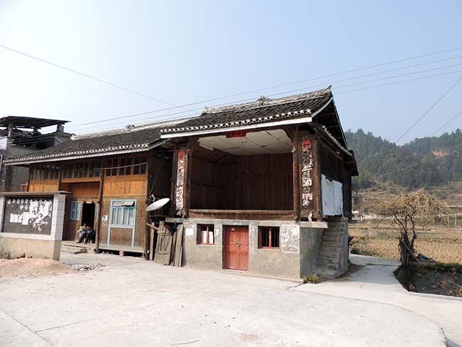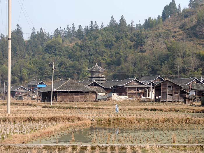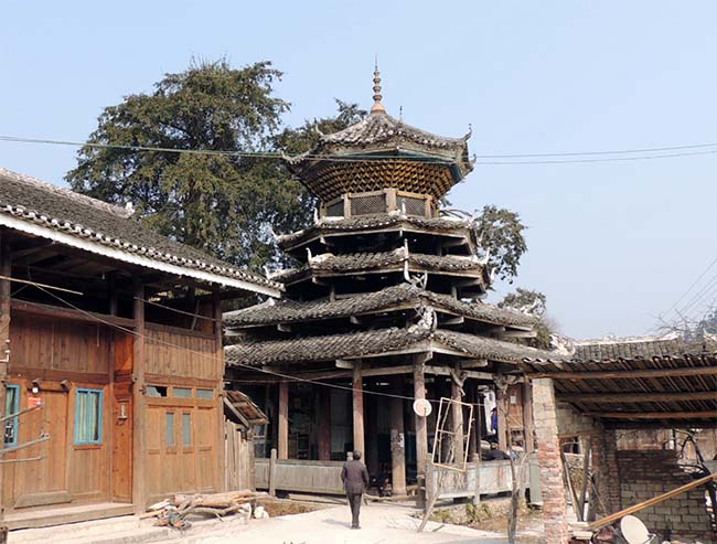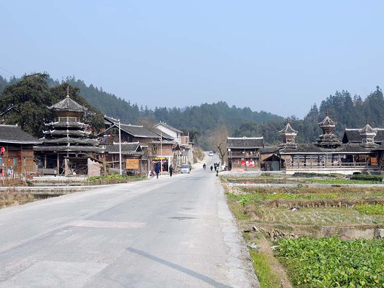 | この日最後に訪れたのは「ばぁ寨」、「ばぁ」というのは土偏に貝」という字。「堰」とか「山間にある平地、盆地」いう意味とのこと。 「寨頭村」からちょっとで、ばぁ寨の入り口が見えてくる。 街道を挟んで鼓楼と風雨橋がある。 この鼓楼はまだ村の中心ではないようだ。 |