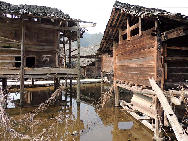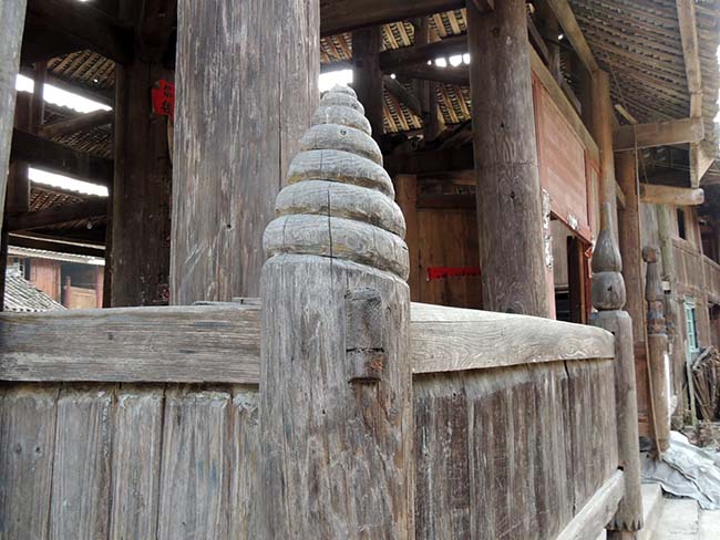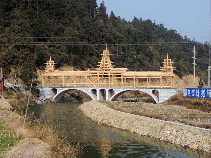 町はずれでは風雨橋を新しく造っていたので、その木組みを見に行った。 |