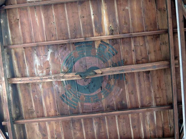 鼓楼の天井には、「太極」と「八卦」が描かれ、黒い菱形の布が付いている。 |