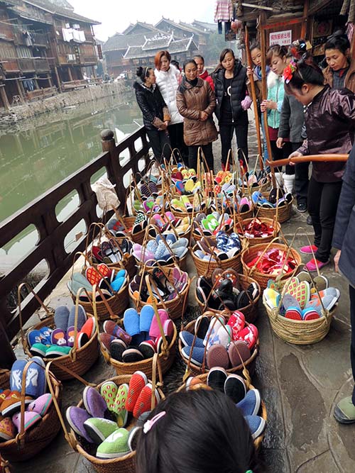 それらを受けっとった新婦側は、新婦を先頭にして手作りの編みスリッパをたくさん持って新郎側へ行進していく。 このスリッパを編むのには結構手間がかかり、道端で売っていたのは、一組数百元していた。 |