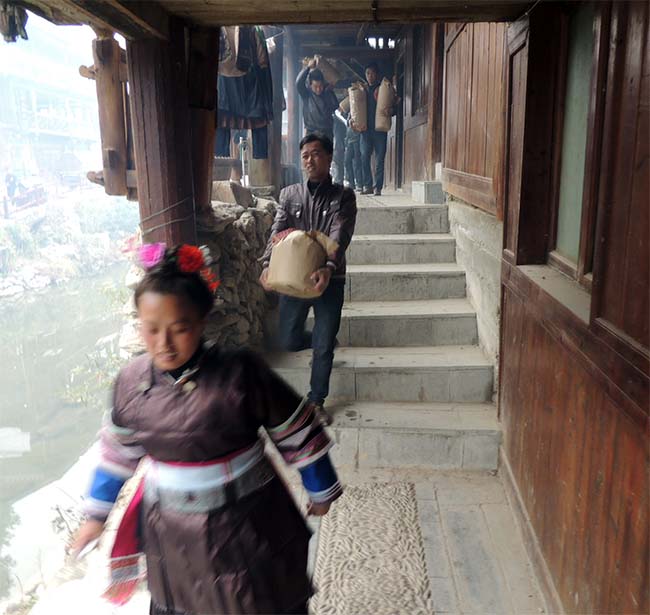 信団鼓楼の近くでは、婚礼行列の準備をしていた。 後でわかったが、こちらは新郎方のほうで、先に新郎の方から餅米で作った「糯米酒(のうみぃちゅう)」などを行列を組んで新婦の家まで持っていく。 |