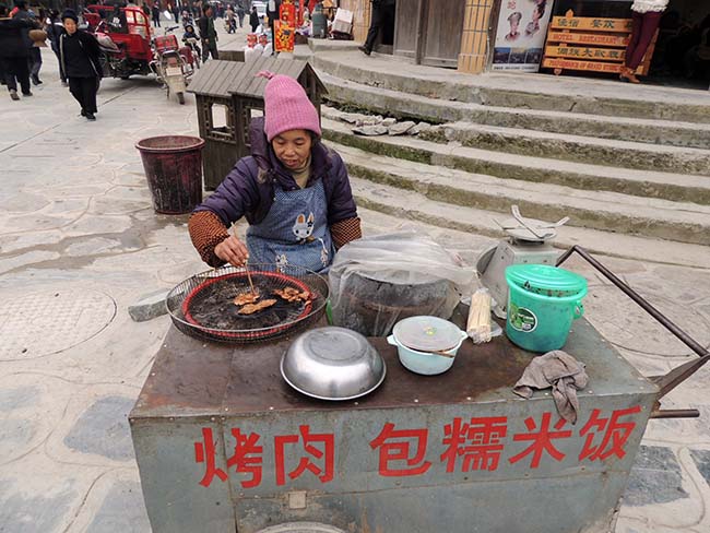 以前だと呼ばれるままに宴会に加わっていたが、このころは尖閣や歴史問題で、日本人とわかると座が白けるので宴会に入れてもらうのは避けていて、定番の炭火焼きの豚肉をはさんだ餅米のお結びで昼飯とした。 |