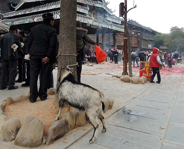 肇興でのお葬式はこれで3度めになり、式次第、1回目と2回目に記録したものとほぼ同じだ。 私が「恵比寿神は太公望か?」と思っている、豚肉で作ったお供え「姜公(太公望)釣り魚」や「蓬莱山」「白兎」もあった。 |