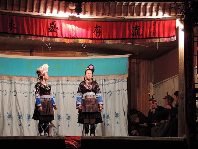 | 2014年春節の4日目、紀堂村での萨玛を祀るお祭りを見てから肇興へ戻った。 行きは山道を登ったが、帰りは共同通信の取材チームの車に乗せてもらって、晩飯もゴチになり、ラッキーであった。 晩飯後、ほろ酔いで村を散歩していて、信団の戯台で侗戯をやっているのに行き当たった。 既に二か所で見て、内容もよくわからないので、今回はとりあえず数分見て、またブラブラと散歩した。 |
