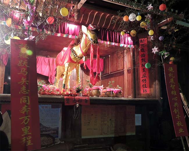 礼団鼓楼の方へ行くと、その正面の戯台に、その年の干支の「馬」の飾り物があった。 |