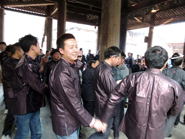 | 2014年の春節の初五、2月4日。 肇興村では午前中は静かでのんびりして、午後、村を散策すると礼団の男たちが芦笙を先頭に行進していたのでついていくと智団鼓楼に行き、そこで智団の女たちと「祭萨玛」か「跴歌」が始まった。 |