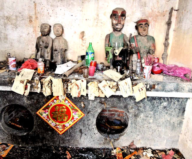 | 神像の前にも「紙銭」が沢山貼られて、祭りのあとが見られた。 |
