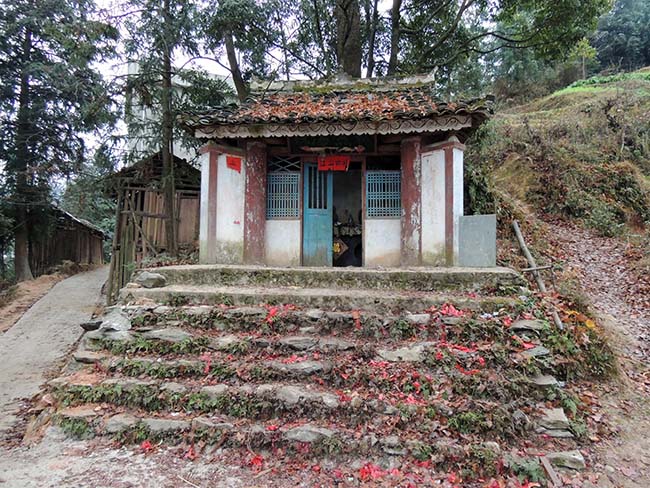 堂安の少し下側の村「厦格(しゃあか)」に入る手前にある「檐公(やんこん)」を祀る祠の前には爆竹の残骸が沢山あり、春節に祭りがあったようだ。 |