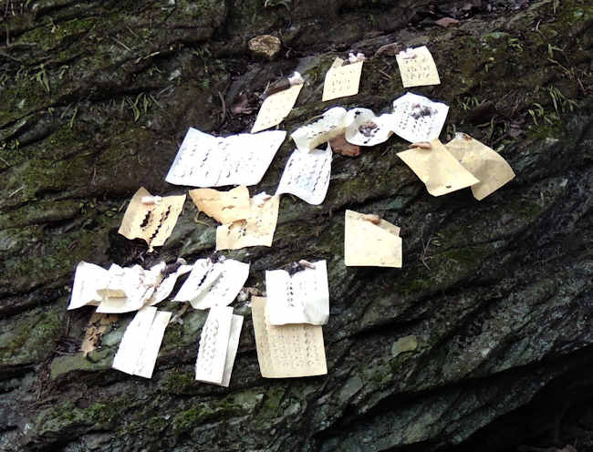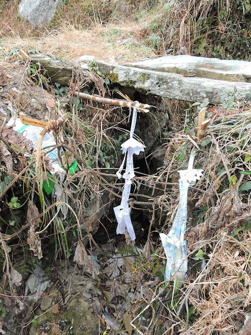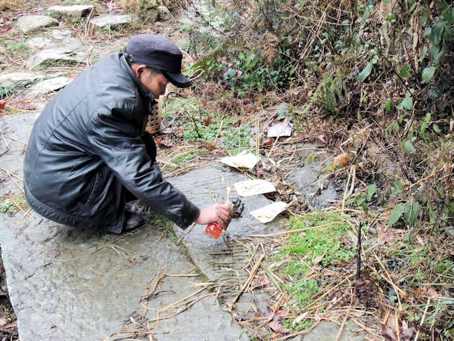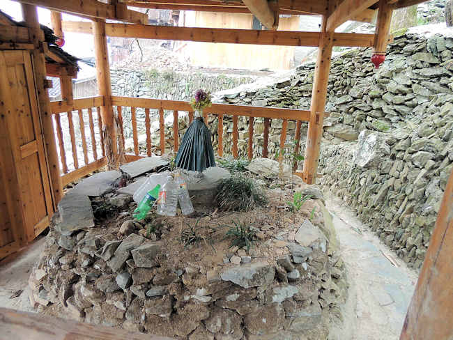 厦格は、上塞と下塞があり、上塞へ登る途中の小さな石橋のところで、おじさんが、紙銭と線香とお茶でその場の神様を祀っていた。 |