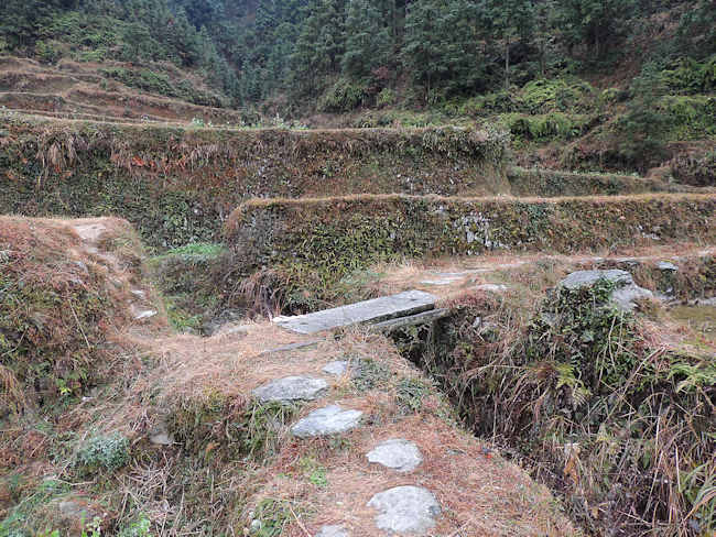 | 2014年2月7日、春節の初八。 肇興の当方の山の中腹にある「堂安(たんあん)」という村で「祭萨玛」の祭りがあるということで朝から山道を登った。 棚田には菜の花が咲いて、黄色が映える。 |