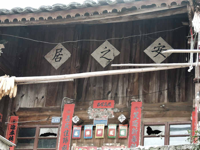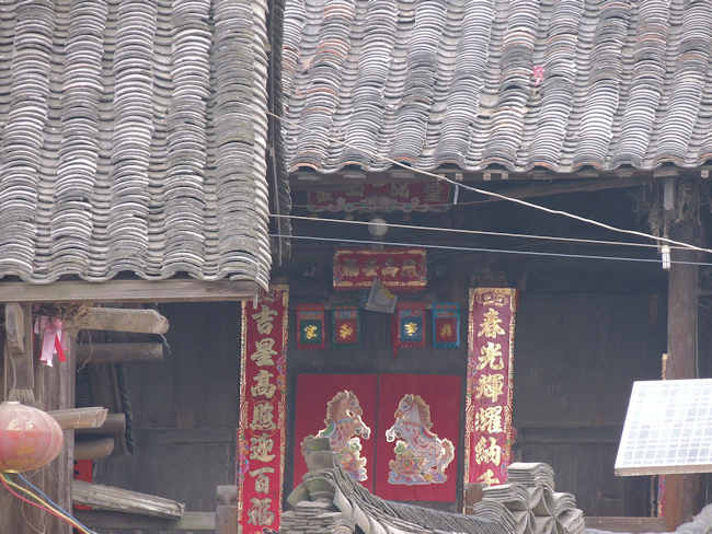 | 凱里へ戻って、旧暦の1月16~20日に舟渓の芦笙節を見物するために、とりあえず2月11日(旧暦12日)、舟渓へ行って、宿泊するところを確保しに行った。 舟渓へは始めて貴州を訪れた旅でも来たことがある。 今回は、とりあえず商店街の1階は商店、2階が食堂、3階以上がホテルになっているところを見つけて、14~20日まで予約して祭りの期間の宿を確保した。 で、今回も街をブラブラする。 ここでは、扉に貼る「対聯」が窓にも貼られている。 |
