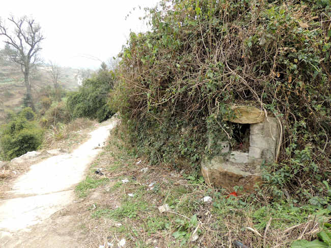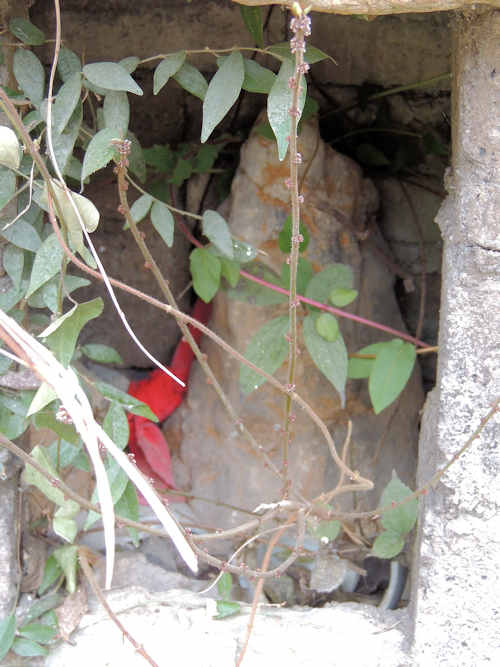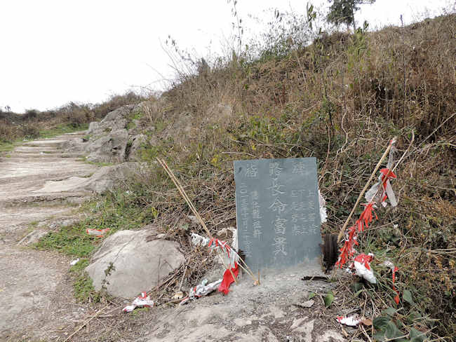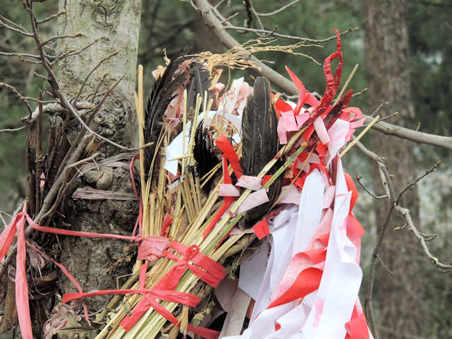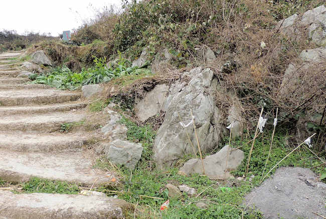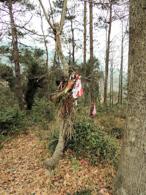 村の西側の山に登ると、道の脇の岩に竹の棒に幣をつけて祀った跡がある。 |
