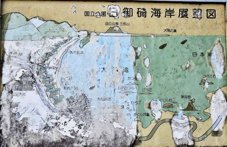 | 2025年11月29日、出雲の旅の2日目。 4時半起床。車中泊した道の駅は車が多いので、とりあえず、前日見つけておいたあまり車のいない近くの「きづき海浜公園」の駐車場へ移動。コーヒーを沸かして、アンパンなどで朝食とする。 この日は、夜に行われる出雲大社の「神迎神事」まで時間があるので、周辺の神社をを巡ることにした。 日御碕神社へ向かう途中、展望台があり、海の向こうに「三瓶山」を臨む。 |