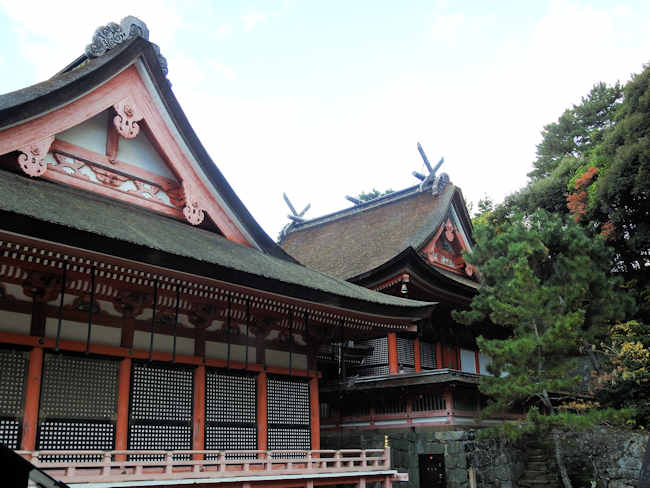 本殿は大社造りではない。 女神を祀るが、鰹木は、3本と奇数で、普通、女神の場合は鰹木は偶数だと思っていたので意外だった。 |