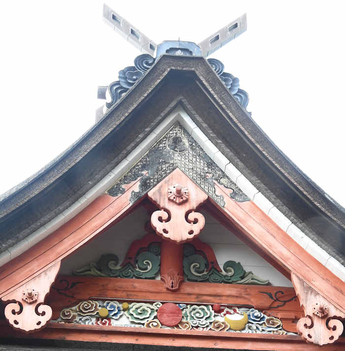神紋は、写真では一部分しか写っていないが「三つ柏」。 妻部分に中央に太陽、右に月、左に星の彫刻があり、それらは、アマテラス、ツクヨミ、スサノオの3姉弟を表している。 |