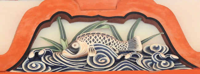 本殿、妻の飾り。 この意匠は、「蓮の花」であるらしい。 |