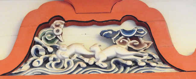 拝殿正面の蟇股は、狐のような動物。 |