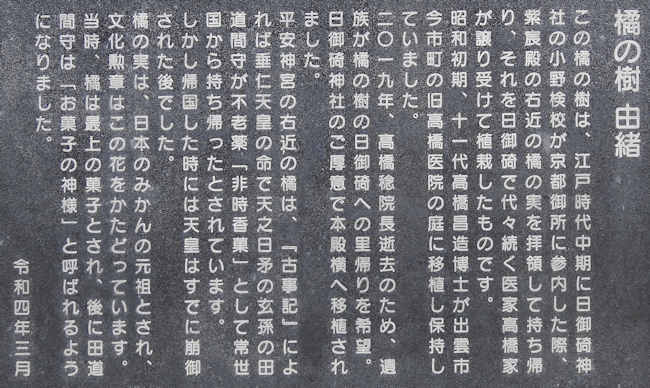 蛭児神社の近くに「橘」の木が植えられている。 橘は、田道間守が常世から持ち帰った、と伝えられているが、私は、「常世」というのは「越」の故地である中国の浙江省だと思っている。 |