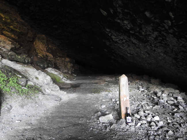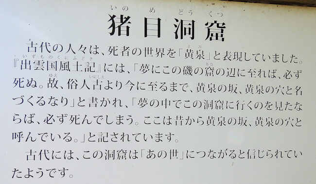 入り口近くに1本の杭があり、これが黄泉の国との境と思われ、それを越して黄泉の国に入り、そして外のこの世に戻った。 今回の旅で何度か「黄泉帰る、蘇る」、生まれ変わりをしたが、ここが1番目。 |