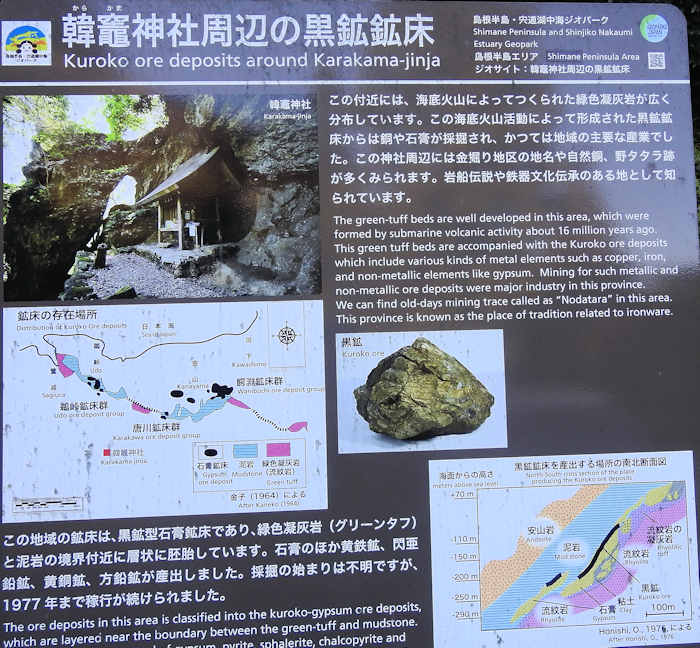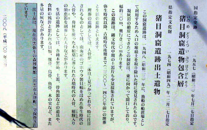日御碕で2時間ほど散策して、10時ごろ次の目的地、「韓竈(からかま)神社」へ向かう。 途中、10時40分、思いかけず、「あの世」に続くという「猪目(いのめ)洞窟」に行き当たった。 |