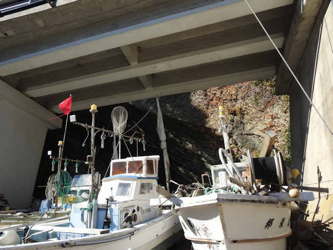 現在、洞窟の前は、高架の道路が横切り、洞窟の前の浜は、船置き場になっている。 |