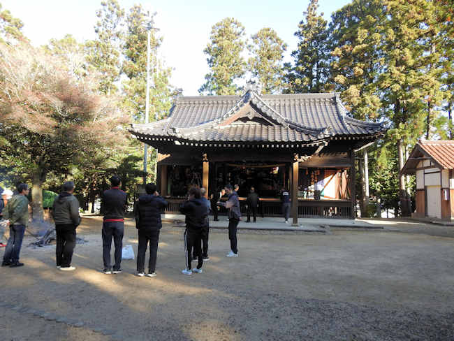 | 初日の11月28日に出雲大社へ向かっているとき、「石見銀山」への道路標識があって、「石見」といえば、「石見神楽」、ネット検索してみると、11月30日に、浜田の大元神社で奉納神楽があることがわかり、浜田市は出雲市から90kmほどでそんなに遠くないので、30日は、それを見に行くことにした。 この日は、5時半起床、6時に浜田の大元神社へ向かう。 ガソリンスタンドに寄ったり、道を間違えたりして、9時過ぎに大元神社のある上府町に到着、大元神社は八幡神社の中にあることを地元に人に聞いてわかり、どこでも空いている場所に駐車していい、と聞いて、八幡神社の鳥居横の空スペースに駐車した。 |