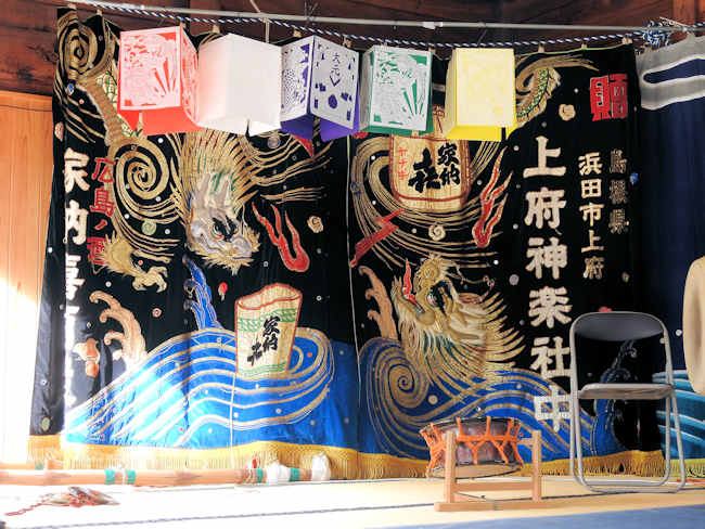 今回の神楽は、地元の上府町の上府神楽社中による奉納神楽。 吊られている行燈のような飾り物は、神楽の出し物の「天蓋」で操られる。 その色は、陰陽五行の東西南北の色で、緑は東、赤は南、白は西、紫(黒)は北、中心が黄色。 |
