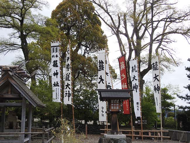 | 脇には、各地区の幟が立つ。 祭りでは、6地区の氏子が神事を奉納する。 |