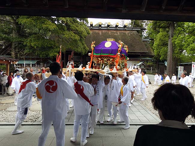 | かねてから海部族の元締めともいえる元伊勢籠神社は訪れたいところであり、毎年4月24には、2500年続く伝統神事の葵祭りがあるとのことで、今年はバイトの無い日に重なり、思い切って見に行った。 前日の23日に籠神社のある宮津市へ移動して籠神社とその周辺の神社などを見て回った。 23日夜は、神社近くの「阿蘇シーサイドパーク」で車中泊、早朝6時過ぎに近くに車を置いたほうが何かと便利だろうと神社の駐車場に入ったが、車を置いて一回り散歩して戻ると、駐車場の入り口に7時半からは祭りのため駐車場は使えなくなる、と看板が出ていて、1日分の駐車代金700円を無駄にして、前日見つけた天橋立近くの無料駐車場へ移動した。 「葵祭り」は、DeAGOSTINI「日本の神社 81 籠神社」によると、 「同社の葵祭の起源は古く、懿徳天皇の御代、皇紀154年(紀元前507)頃であるとされる。往古は4月の二の午の日に斎行されていたが、明治以降、新暦が採用されてからは4月24日に行われている。 同名の祭事は『賀茂祭』として京都の下鴨神社(賀茂御祖神社;かもみおやじんじゃ)と上賀茂神社(賀茂別雷神社;かもわけいかづちじんじゃ)で行われているものが有名だが、賀茂祭が「葵」を装飾に用いるのに対して、同社では「藤の花」を祭員の冠に挿すのが習わし。豊受大神をはじめとした同社のご祭神が藤と由縁を持ち、奥宮・眞名井神社の鎮座地が藤岡山(天香語山)であるなど、藤は籠神社と縁が深く、同社の葵祭は当初「藤祭」と呼ばれていたという。 祭りの当日は一番太鼓が開催を告げたあと、鳳輦(ほうれん)にご祭神の御霊をお遷しする神幸祭が執り行われ、祭りの要である御神幸(お渡り)へと進む。これはご祭神の再誕を示す『御生(みあ)れの神事』であり、『御蔭(みかげ)神事』とも呼ばれ、同社の最重要神事である。この神事は豊受大神の御生れの祭りとして発祥したが、のちに同神を祀った海部氏の祖神・彦火明命が宿縁によって丹波道主王(たにわのみちぬしのみこ)に生まれ変わり、天下に神威を示したことを伝える神事になったと伝わる。」 「葵祭の見どころは、各地区の氏子が奉納する『太刀振神事』。氏子たちは長い柄の太刀を振り回して妙技を披露する。これは神幸行列の前後を清める悪神調伏の神事で、貞観年間(859~877)に始まったと伝えられる。このほかに『大神楽』『鶺鴒囃子(ささばやし)』『大獅子』といった芸能が奉納される。」 |