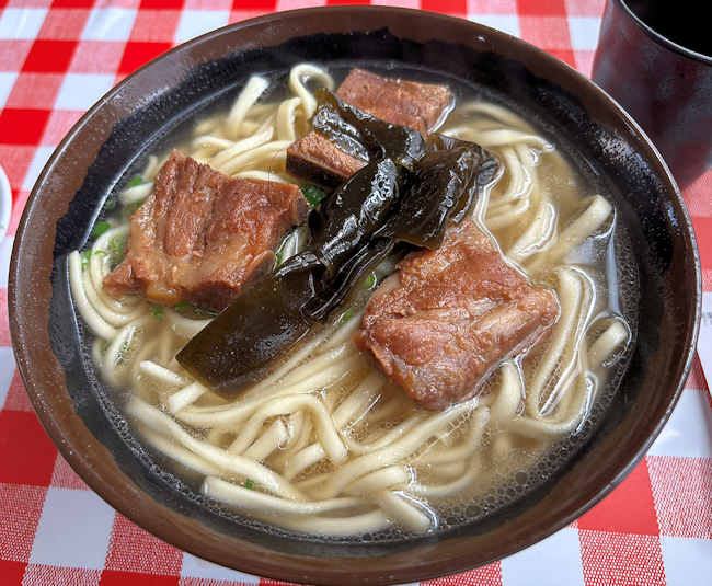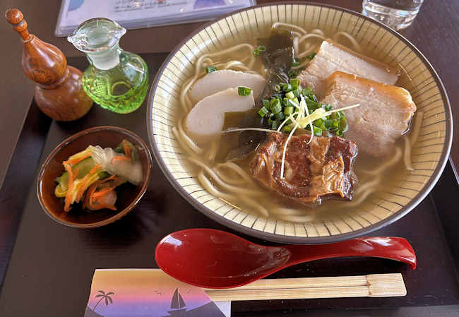 午後にKさんが迎えに来てくれるということで、久米島行フェリーの切符を買うために泊港の旅客ターミナルビル「とまりん」へ行って、そこで合流することにした。 お昼時、何にしようかと迷ったが、とまりん内のカフェに入ると、やはりメインはカレーと沖縄そば、ということで、迷ったときは「沖縄そば」。 ここは、ソーキ(豚のあばら軟骨)と昆布ものる。 |