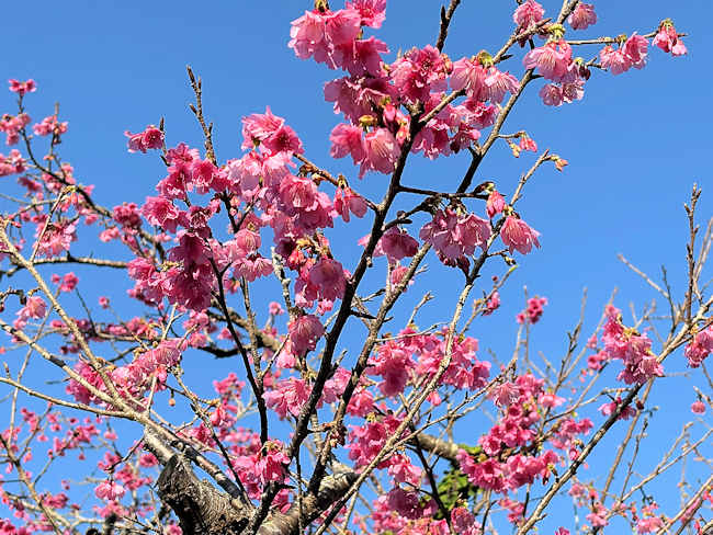 食後は、とまりんの隣にある公園で日向ぼっこをして過ごし、Kさんと合流して名護へ向かい、名護の野球場前のホテルにチェックイン。 夜は、名護の串焼きの店で旧友たちと飲む。 25日に今回の仕事の那覇にある事務局の責任者に会うことになっていて、24日はフリーになり、その日は土曜日で那覇の手ごろな値段のホテルは満室で、名護で連泊することにして、車もKさんから貸してもらい、そこらをドライブすることにした。 ただ、どこを見たい、ということもなく、そうだこの時期は寒緋桜だ、と桜見物で有名な八重岳へ向かった。 まだ三分咲きぐらいだったが、頂上のほうへ行くと八分咲きぐらいの木もあり、まずまずの桜見物。 |