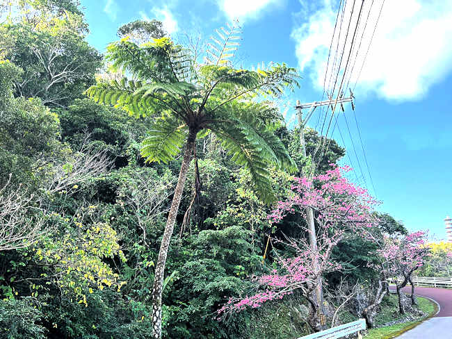 南国らしい「ヘゴの木」に並んで、桜が咲いている。 |