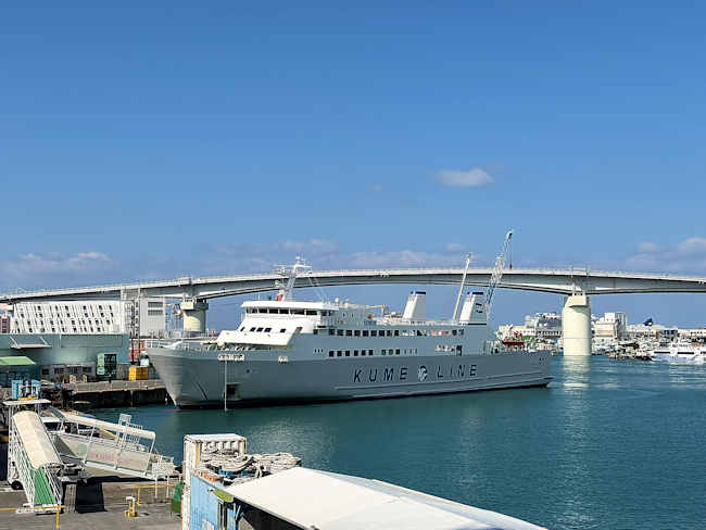 で、この日はのんびりして過ごし、夜はこれもホテルのすぐ近くで見つけたピザとスパゲッティの店で、何年かぶりにミックスピザとビール。 翌朝25日、車を返しに行き、高速バスで那覇へ。 泊港の「とまりん」に荷物を預けて、事務局へ挨拶に行き、とまりんへ戻って14時発の久米島フェリーで、いざ、久米島へ。 那覇と久米島を結ぶ飛行機は30分で行けるそうだが、何しろ価格が高い。飛行機と船では1万円ほどの差があるし、急ぐ旅でもなし、船でも3時間でいけるので、船で行く旅情も楽しめるだろう、とフェリーを選んだ次第。 |