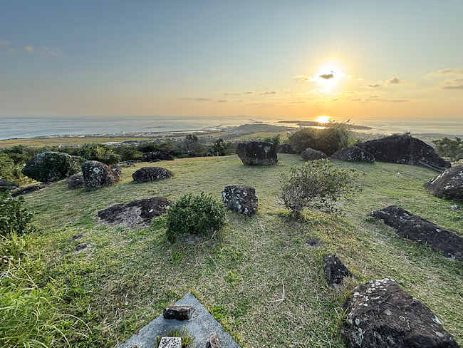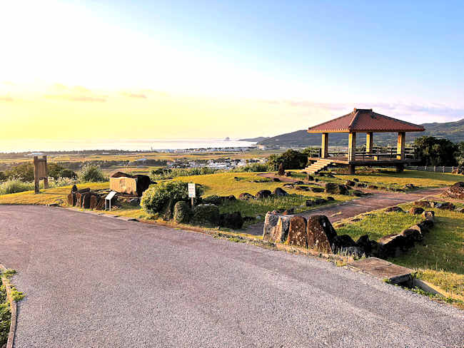ここの城跡は、他の城跡のように石垣がないので、あまり城跡という感じはしない。 「登武那覇園地」から続く舗装道路をもう少し上ると、石積みの名残の大きな石が点在する城跡がある。 ここからの眺めは素晴らしい。 |