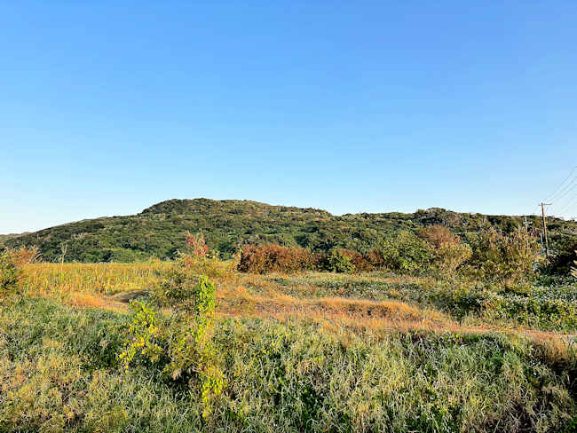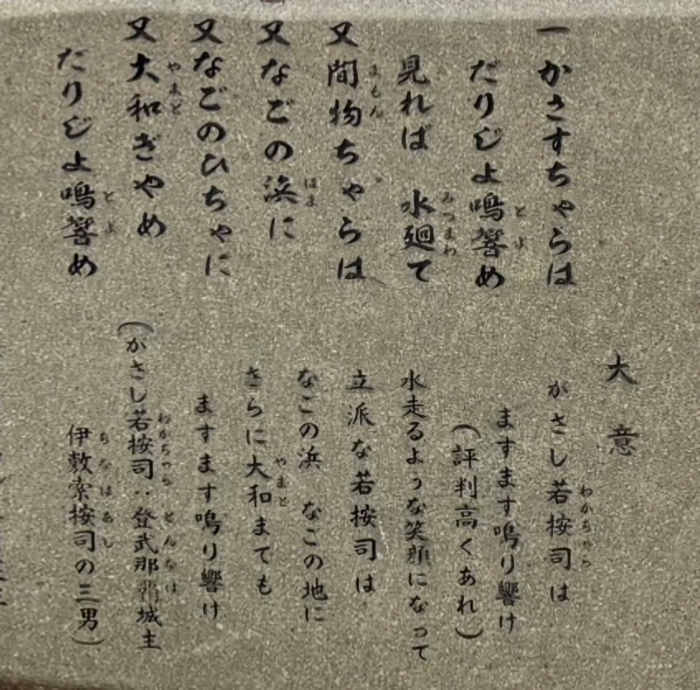 「登武那覇城跡(とんなはじょうあと)」については、博物館で手に入れた「久米島文化スポットガイドマップ33」によると、 ここは、町指定史跡。 「登武那覇城跡は、久米島町役場仲里庁舎の北方約500mのところにあるトンナハ山(標高120m)の南側斜面の中腹にあります。城主は伊敷索(ちなは)按司の三男で笠末若茶良(がさしわかちゃら)と称され、宇江城城や具志川城の城主と異母兄といわれています。この城は他の城が山の頂上や海に面した断崖上に築城されているのに対し、山の中腹の斜面に位置し、石垣も安山岩の大石と大石の間を小さな安山岩を野面積みにしてつないでいるだけです。城内からはグスク系土器片、須恵器類、青磁片等がわずかに確認されています。 笠末若茶良のことを歌ったオモロが数首あり、登武那覇城周辺の住民から慕われる人望厚い城主であったことがうかがえます。」 その笠末若茶良のことを歌ったオモロが一首、石に刻まれている。 |