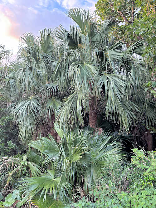ここの園地には広い芝地がありそこを取り囲んで林があって、その中に「蒲葵の木」を見つけた。 やっと蒲葵の実物に出合えた。 |