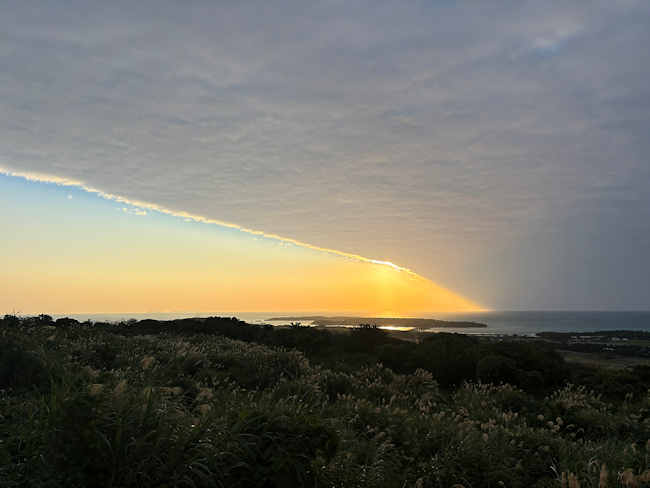 比嘉朝進著「沖縄の季節と行事」では、 「蒲葵(くば)はなぜ神木なのか (クバは方言名)」として、次のように記している。 「和名は枇榔(びろう)。漢名蒲葵。クバはマラヤ語クラバの転化という。海辺・山地に自生するヤシ科。幹は直立して20mにもなり、神が天から降りるときの依り代にするといわれ、神木として御嶽に林立している。幹は蛇のうろこ状を呈し、むかし蛇信仰のシンボルにされたという説がある。1mほどの幅広い葉は天狗の羽うちわのように広がる。黄色の花序は、並木なら市街美を添える。「クバぬ若クバや笠張てぬ美らさ・・・」と琉歌に詠まれているように、葉を編んで蓑や笠を作ったり、円形に切ってウチワとする。」 2月5日の朝に登武那覇園地から見た、「晴れと曇りの境界」。 |