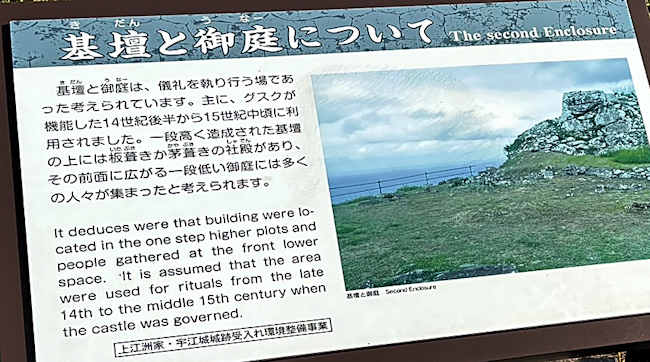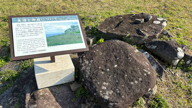 「仲里村史第6巻資料編5民俗」によると、てっぺんの中央にある平らな石は、御嶽の祭場とのこと。 「仲里城御嶽 宇江城跡の中にあって、最高峰の広場の中央に一平方程の平板状の安山岩があり、ここが祭場である。香炉や三つ石は無い。」 |