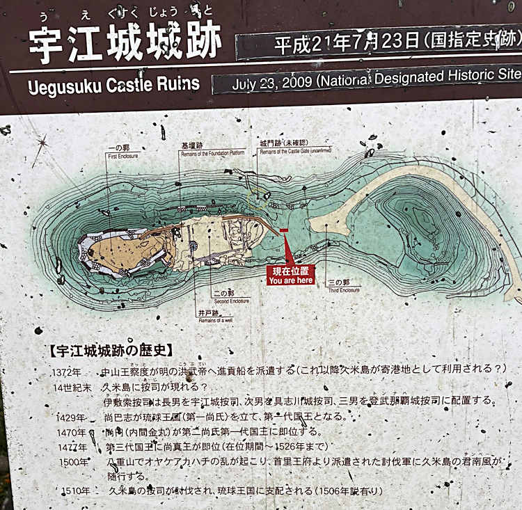 | 博物館で手に入れた「久米島文化スポットガイドマップ25」によると、 ここは、国指定史跡。 「久米島で最も高い宇江城岳(310m)の山頂に築かれた山城のグスクです。 グスクは三つの郭で構成され、城壁は平割にした安山岩の野積みによって築かれています。上壇一の郭の東側の石垣は城内で最も高く、物見跡といわれています。下側の郭の城壁は低く、前大戦まで城門などもよく残っていたといわれています。戦後米軍の基地内になり、復帰後に自衛隊施設に移管され、平成13年度に施設の一部が返還になり、現在では城内への出入りが自由になりました。 記録によれば、伊敷索(ちなは)按司の長男、久米中城(くめなかぐすく)按司が堂の比屋の下女オトチコバラの勧めでこの地に定め、築城は むくち樽金が請負い、ティヤントールという石工の協力を得て完成したとあります。 尚真(しょうしん)王代に王府軍の攻撃を受け、火攻めにあって落城したと伝えられています。これまでの発掘調査により中国製陶磁器が大量に出土しています。」 |