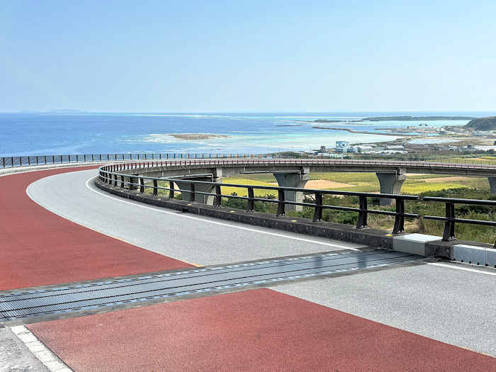 島の東側から宇江城城跡へ向かう道は、海辺の平地の真謝集落から一気に島北部の海抜100mの段丘に上り、そこには「つむぎ橋・ていだ橋」と名付けられている高架道路が架けられていて、天空を走るような感じ。 左手遠くに渡嘉敷島、中央にハテの浜、右手奥武島の手前にはシールガチ橋が見渡せる。 |