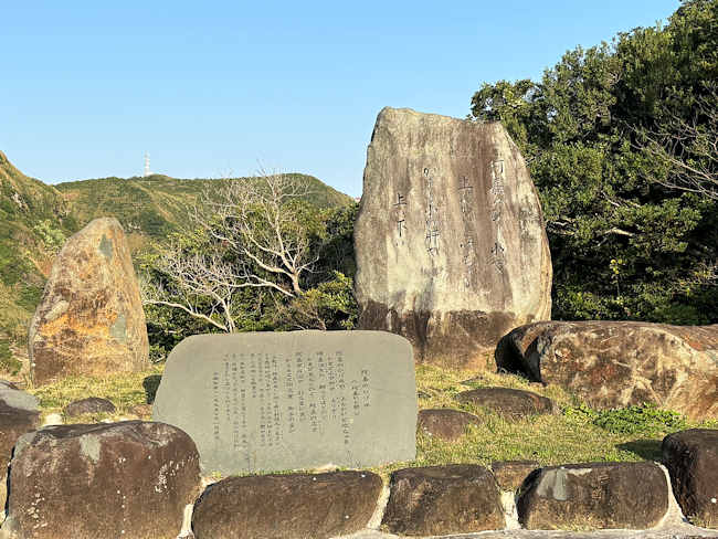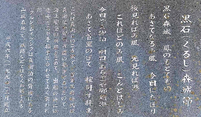 ここには、「黒石森城節(くるしむいぐしくぶし)」の歌碑がある。 「黒石森城」というのは、城跡ではなく、真謝泊の背後にあるこの山のことで、御嶽があるそうだ。 |