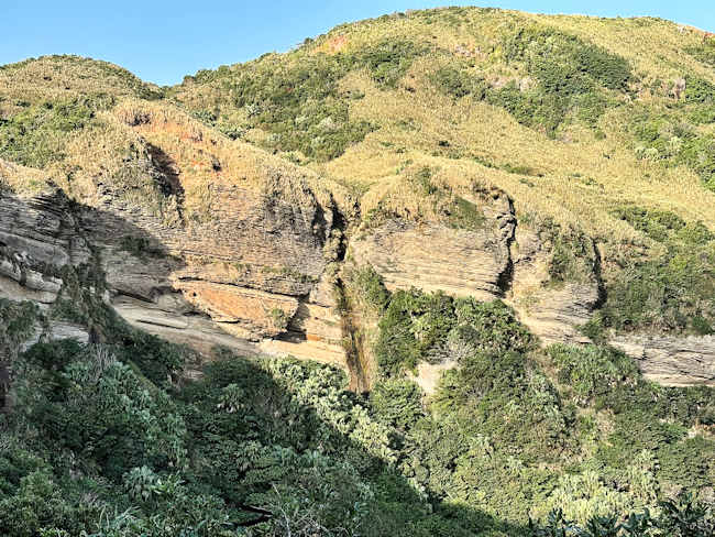 そして、この阿嘉集落を過ぎるすぐのところに、「阿嘉のひげ水」がある。 「久米島文化スポットガイドマップ28」によると、 町指定名勝 「阿嘉のヒジミジは、旧阿嘉集落の背後に屏風を張り巡らしたようにそり立った断崖の上に懸かる小さな滝のことです。強い北風をまともに受けると逆に吹き上げられ、飛散霧消し、その光景は左右の岸壁の奇と相まって壮観な光景を見せてくれます。」 この日は雨の降らない日々が続いているせいか、滝の水は落ちていなかった。 |