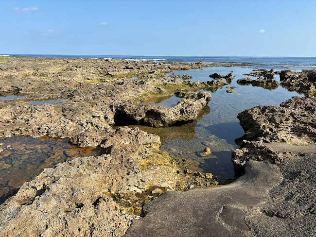 比屋定バンダを過ぎて少し行くと「熱帯魚の家」への標識があり、段丘を行く道路からはずれて海岸へ下りていく。 |