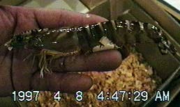 1997年4月8日早朝に築地市場を訪問して来た際、オーストラリアで養殖されているクルマエビが入荷していました。オーストラリアから日本へクルマエビが送られて来るようになったのは5,6年前からだと思います。5年前に見た時にも感じましたが、形態的には日本産のものと変わらないようですが、一見して体の模様が若干異なるのが特徴です。