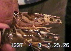 聞くところによれば、天然の親エビの生息している所は、グレート・バリア・リーフ近辺の水域とのことで、生息環境の違いが模様に表われているのかもしれません。クマエビ(P.semisulcatus)やウシエビ(P.monodon)なども生息環境で体色や模様が随分違います。(1997.04.12)