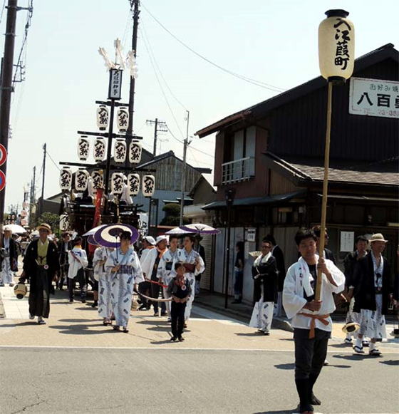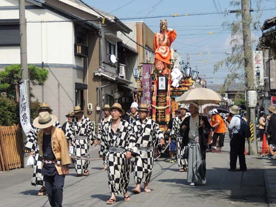 多くは提灯12個をぶら下げた十二張山形という祭車だが、蘭陵王や神功皇后などの人形を載せたものもある。