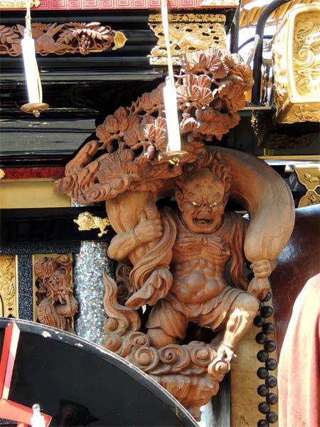 祭車は漆塗りですばらしい木彫りの飾りもつき豪華なものだ。